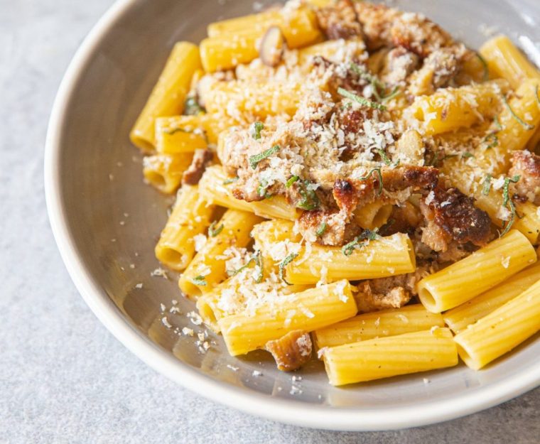 Angkat panci dari api dan aduk tiga per empat daun sage, keju, dan kacang chestnut. Saus harus melapisi pasta dengan lapisan mengilap. Tambahkan sedikit air jika campuran terlihat terlalu kental. Beri bumbu sesuai selera. Bagi pasta ke dalam piring dan beri sisa daun sage, keju, dan kacang chestnut untuk disajikan.