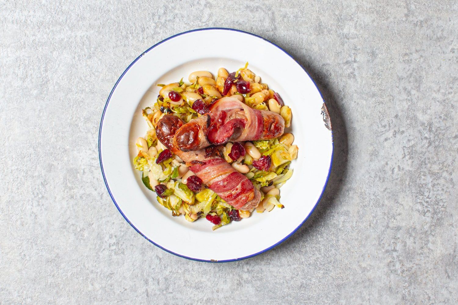 Letakkan sosis yang dibungkus di atas kacang dan tuangkan sisa minyak di atasnya.